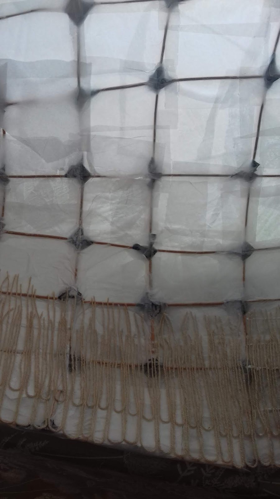 Whilst I had made withy sculptures before, I hadn't covered them with tissue before, so I asked Sian for a quick demonstration. She told me I needed to cover them in cling film first to give an even surface to stick the tissue paper to. That was much more of a palaver than I had expected! Cling film is not the most co-operative material at the best of times when trying to cover a sandwich, let alone a 4 ft stick sculpture! And then there's the serrated blade that is 'helpfully' put on the box to tear the cling film...several cuts and a few cling film/selotape related tantrums later, Sian showed me how to apply the tissue paper. She made it look so easy! Simply water down the PVA glue a little, then tear a little piece of tissue paper, place it on the clingfilm and brush a little of the glue solution over it to keep it in place. You have to be soooo gentle and use a really soft brush, otherwise it crumples up and pretty much disintegrates before your eyes. At least the cat lost interest once they were covered in tissue and he couldn't see the sticks...
